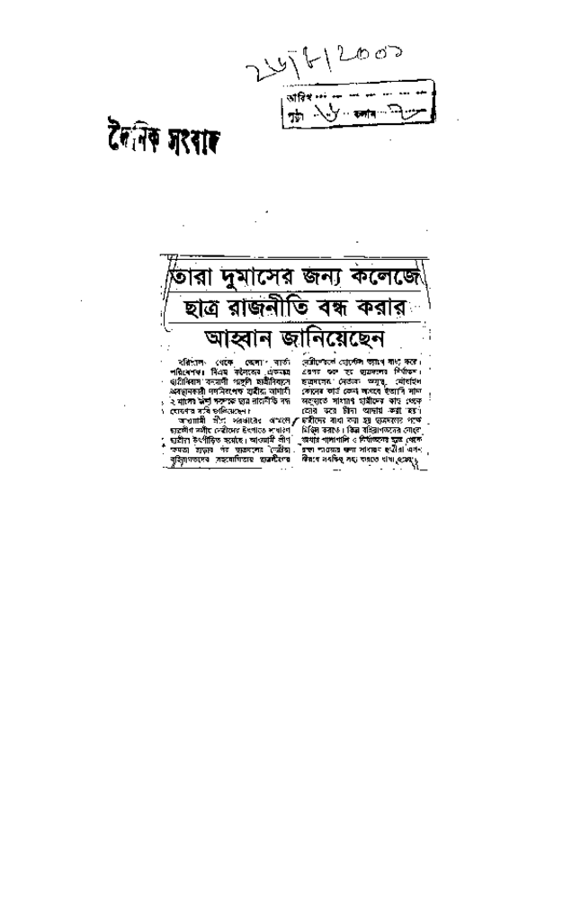 তারা দুমাসের জন্য কলেজে ছাত্র রাজনীতি বন্ধ করার আহবান জানিয়েছেন Published on Newspaper দৈনিক সংবাদ Category Student Politics Download