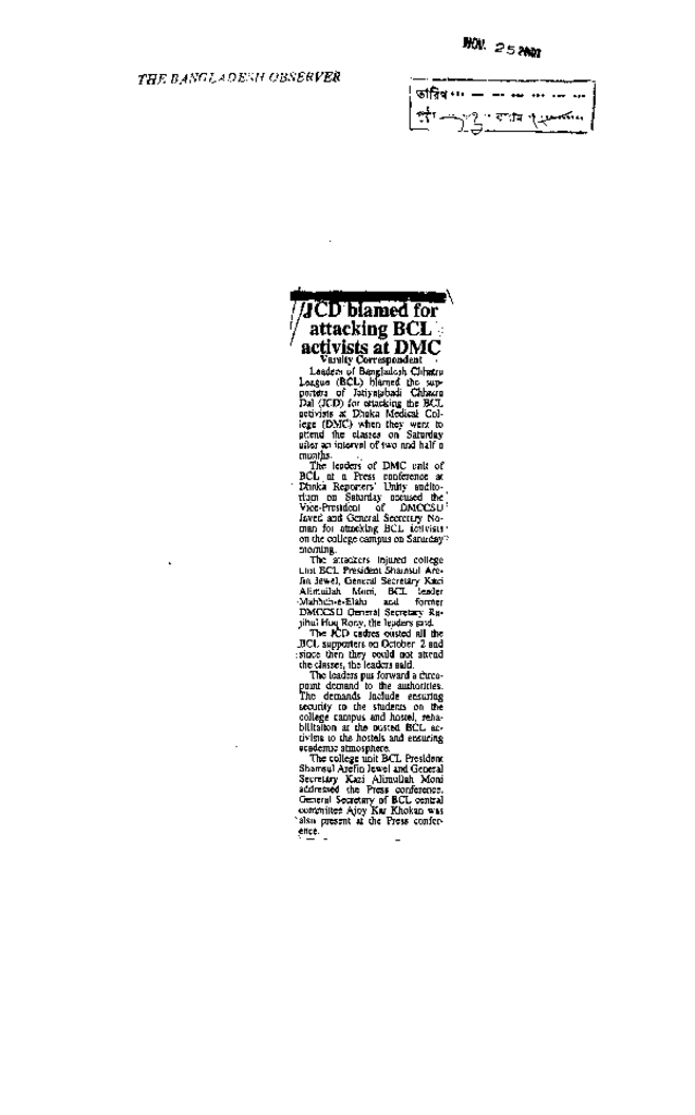 JCD blamed for attacking BCL activists at DMC Published on Newspaper The Bangladesh Observer Category Student Politics Download