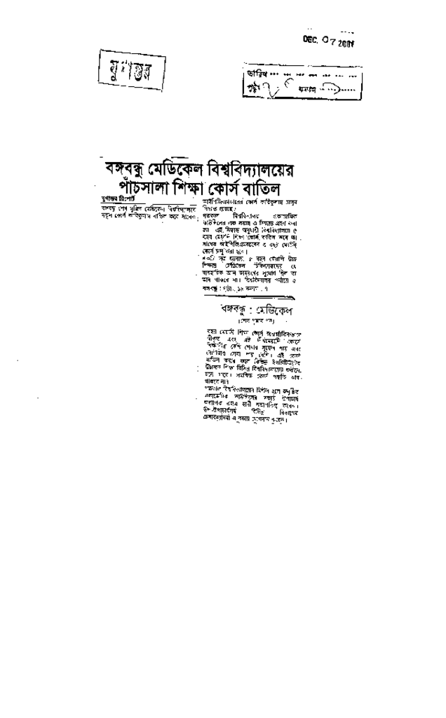 বঙ্গবন্ধু মেডিকেল বিশ্ববিদ্যালয়ের পাঁচসালা শিক্ষা কোর্স বাতিল Published on Newspaper দৈনিক যুগান্তর Category Professional Education Professional Education Medical Download