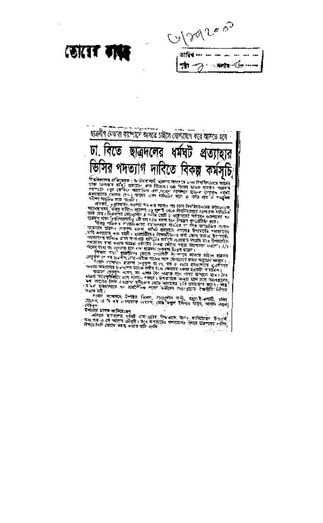 ঢা.বিতে ছাত্রদলের ধর্মঘট প্রত্যাহার ভিসির পদত্যাগ দাবিতে বিকল্প কর্মসূচি Published on Newspaper দৈনিক ভোরের কাগজ Category Student Politics Download