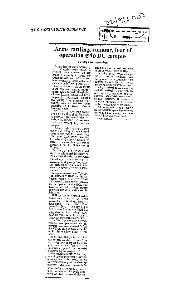Arms rattling, rumour, fear of operation grip DU campus Published on Newspaper The Bangladesh Observer Category Campus Terrorism Download