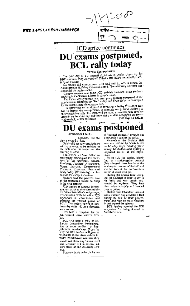 DU exams postponed, BCL rally today Published on Newspaper The Bangladesh Observer Category Student Politics Download