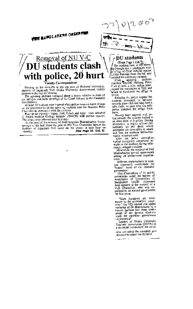 DU students clash with police, 20 hurt Published on Newspaper The Bangladesh Observer Category Campus Terrorism Download