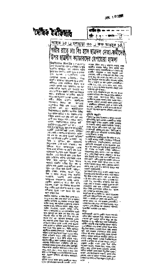 গভীর রাতে ঢাঃবিঃ হলে ছাত্রদল নেতা কর্মীদের উপর ছাত্রলীগ ক্যাডারদের বেপরোয়া হামলা Published on Newspaper দৈনিক ইনকিলাব Category Campus Terrorism Download