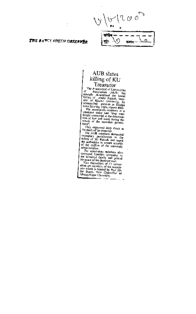AUB slates killing of KU Treasurer Published on Newspaper The Bangladesh Observer Category Others Download