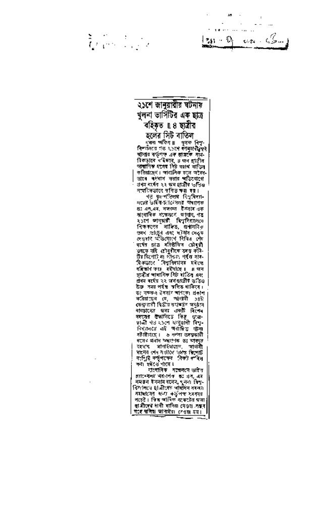 ২১ জানুয়ারীর ঘটনায় খুলনা ভার্সিটির এক ছাত্র বহিষ্কৃত // ৪ ছাত্রীর হলের সিট বাতিল Published on Newspaper দৈনিক ইত্তেফাক Category Campus Terrorism Download
