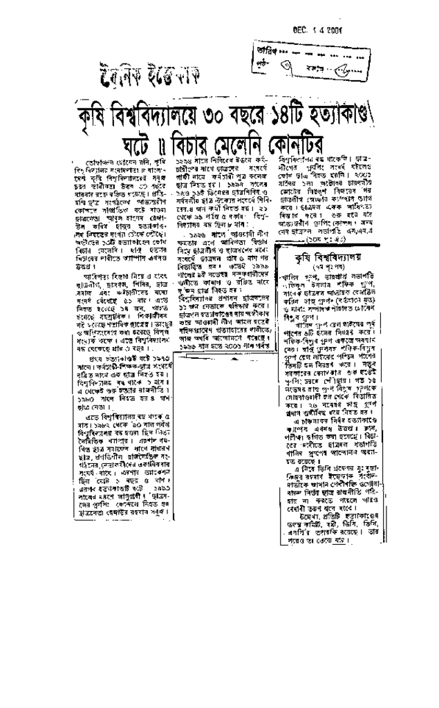 কৃষি বিশ্ববিদ্যালয়ে ৩০ বছরে ১৪টি হত্যাকাণ্ড ঘটে // বিচার মেলেনি কোনটির Published on Newspaper দৈনিক ইত্তেফাক Category Campus Terrorism Download
