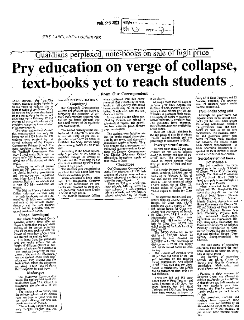 Pry education on verge of collapse, text-books yet to reach students Published on Newspaper The Bangladesh Observer Category Child Education Download