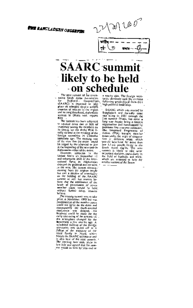 SAARC summit likely to be held on schedule Published on Newspaper The Bangladesh Observer Category Others Download