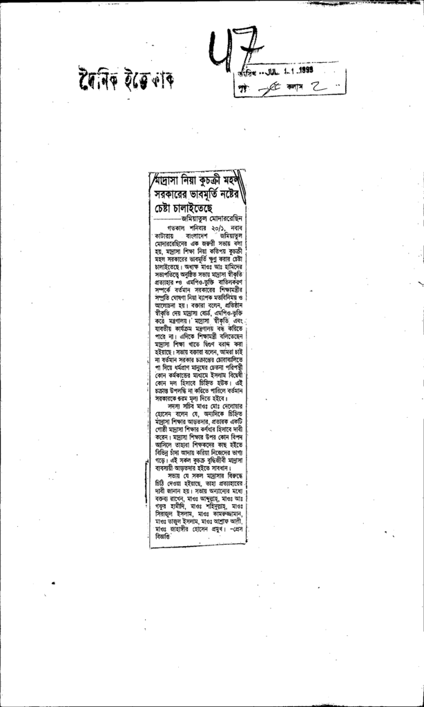 মাদ্রাসা নিয়া কুচক্রী মহল সরকারের ভাবমূর্তি নস্টেন চেষ্টা চালাইতেছে Published on Newspaper দৈনিক ইত্তেফাক Category Madrasah Education Madrasah Education Alia Download