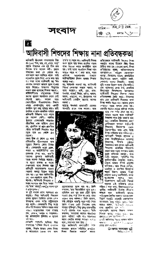 অদিবাসী শিশুদের শিক্ষায় নানা প্রতিবন্ধকতা Published on Newspaper দৈনিক সংবাদ Category Child Education Download