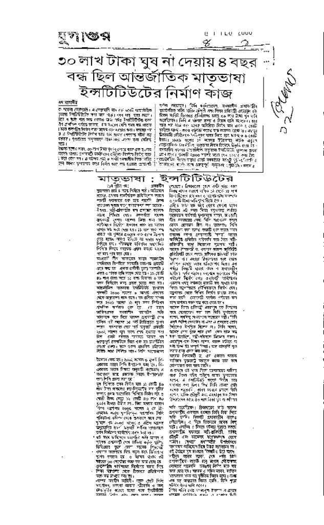 ৩০ লাখ টাকা ঘুষ না দেয়ায় ৪ বছর বন্ধ ছিল আন্তর্জাতিক মাতৃভাষা ইন্সটিটিউটের নির্মাণ কাজ Published on Newspaper দৈনিক যুগান্তর Category Campus Terrorism Download