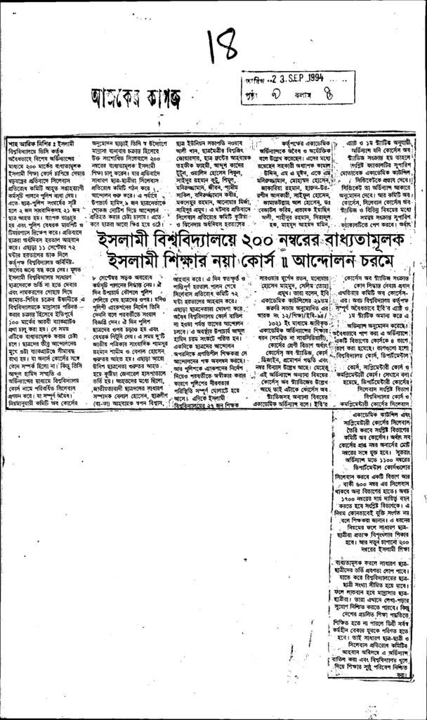 ইসলামী বিশ্ববিদ্যালয়ে ২০০ নম্বরের বাধ্যতামূলক ইসলামী শিক্ষার নয়া কোর্স ।। আন্দোলন চরমে Published on Newspaper দৈনিক আজকের কাগজ Category General Education General Education Higher Education Public Download