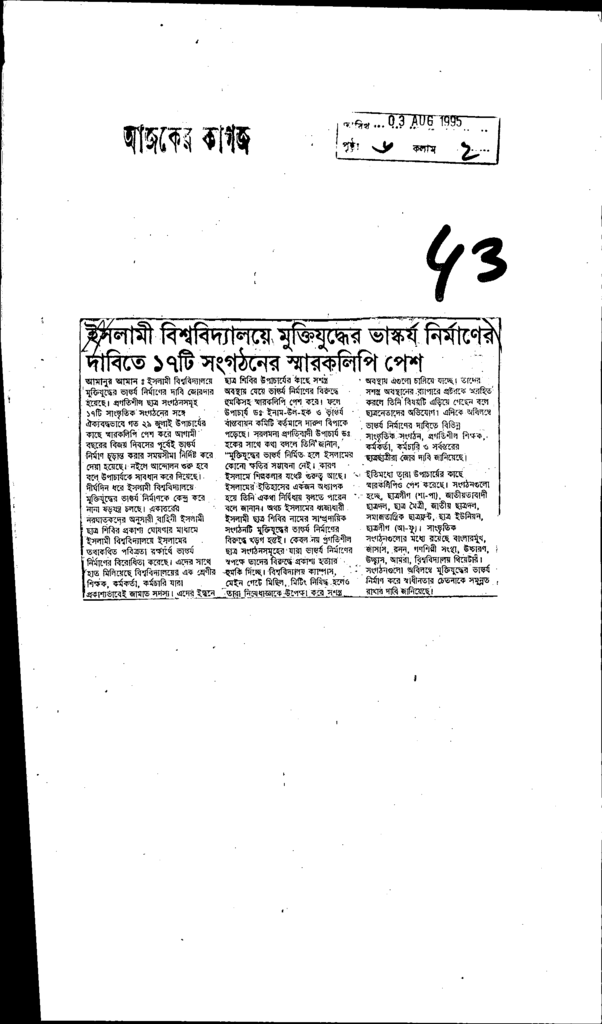 ইসলামী বিশ্ববিদ্যালয়ে মুক্তিযুদ্ধের ভাস্কর্য নির্মাণের দাবিতে ১৭টি সংগঠনের স্মারকলিপি পেশ Published on Newspaper দৈনিক আজকের কাগজ Category General Education General Education Higher Education Public Download