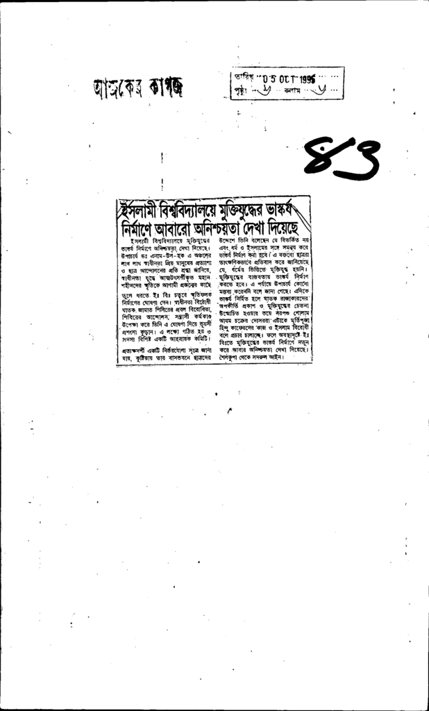ইসলামী বিশ্ববিদ্যালয়ে মুক্তিযুদ্বের ভাস্কর্য নির্মাণে আবারো অনিশ্চয়তা দেখা দিয়েছে Published on Newspaper দৈনিক আজকের কাগজ Category General Education General Education Higher Education Public Download