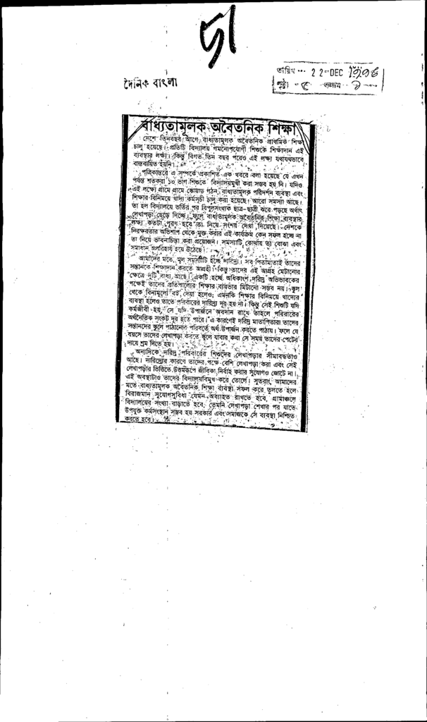 বাধ্যতামূলক অবৈতনিক শিক্ষা Published on Newspaper দৈনিক বাংলা Category General Education General Education Download