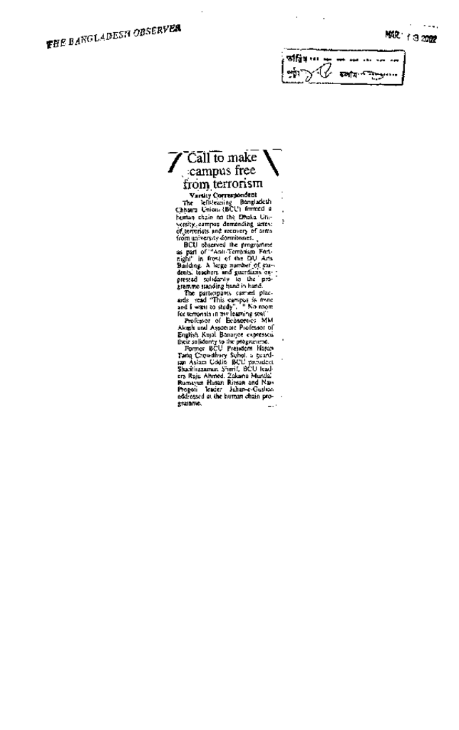 call to make campus free from terrorism Published on Newspaper The Bangladesh Observer Category Campus Terrorism Download