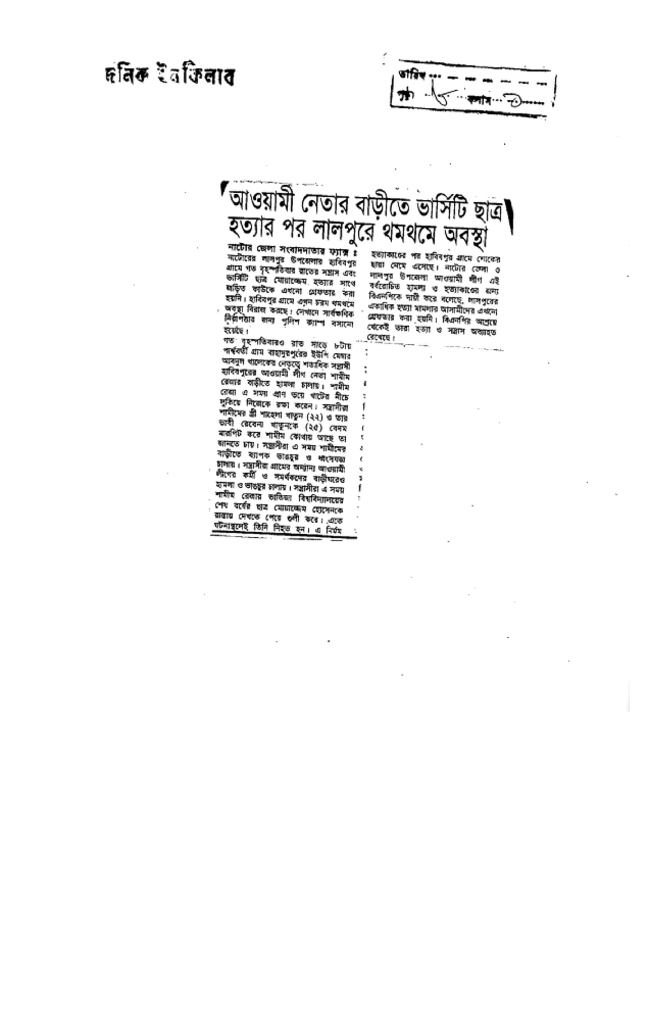আওয়ামী নেতার বাড়ীতে ভার্সিটি ছাত্র হত্যার পর লালপুরে থমথমে অবস্থা Published on Newspaper দৈনিক ইনকিলাব Category Campus Terrorism Download
