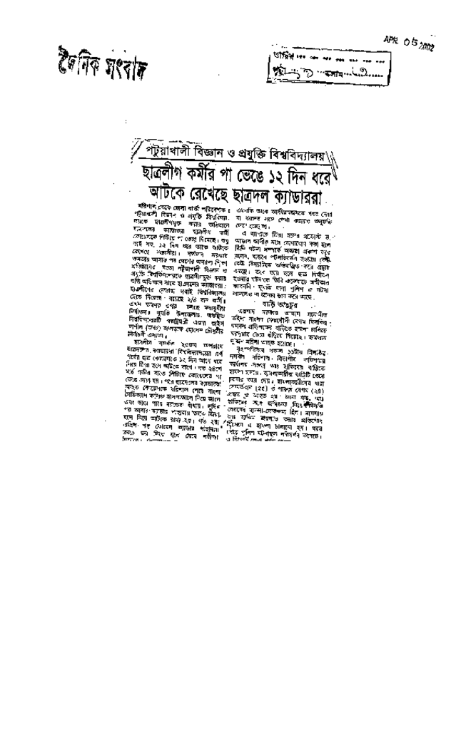 ছাত্রলীগ কর্মীর পা ভেঙে ১২ দিন ধরে আটকে রেখেছে ছাত্রদল ক্যাডাররা Published on Newspaper দৈনিক সংবাদ Category Campus Terrorism Download
