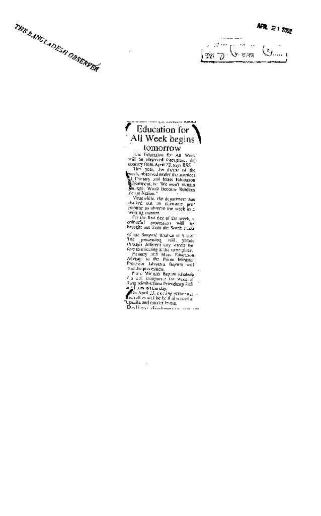 Education for All Week begins tomorrow Published on Newspaper The Bangladesh Observer Category Educational Week Download