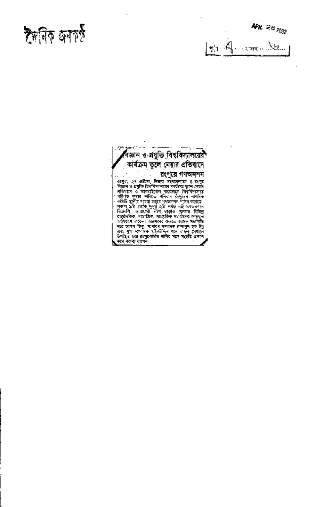বিজ্ঞান ও প্রযুক্তি বিশ্ববিদ্যালয়ের কার্যক্রম তুলে নেয়ার প্রতিবাদে রংপুরে গণঅনশন Published on Newspaper দৈনিক জনকণ্ঠ Category Professional Education Professional Education Engineering Download