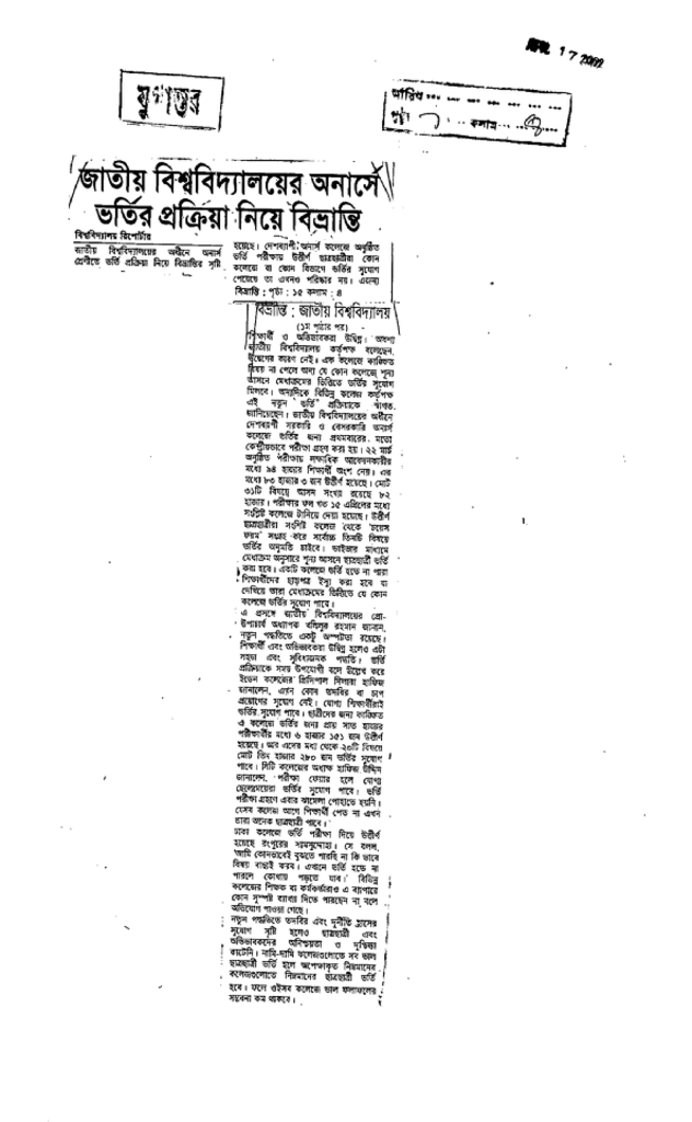 জাতিয় বিশ্ববিদ্যালয়ের অনার্সে ভর্তির প্রক্রিয়া নিয়ে বিভ্রান্তি Published on Newspaper দৈনিক যুগান্তর Category Admission / Seat Problem Download