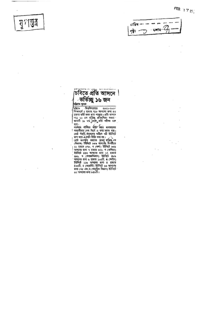 চবিতে প্রতি আসনে ভর্তিচ্ছু ১৬ জন Published on Newspaper দৈনিক যুগান্তর Category Admission / Seat Problem Download