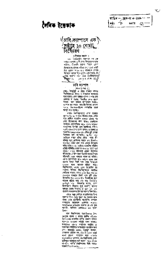 ঢাবি ক্যাম্পাসে এক সপ্তাহে ১০ বোমা বিস্ফোরণ Published on Newspaper দৈনিক ইত্তেফাক Category Campus Terrorism Download