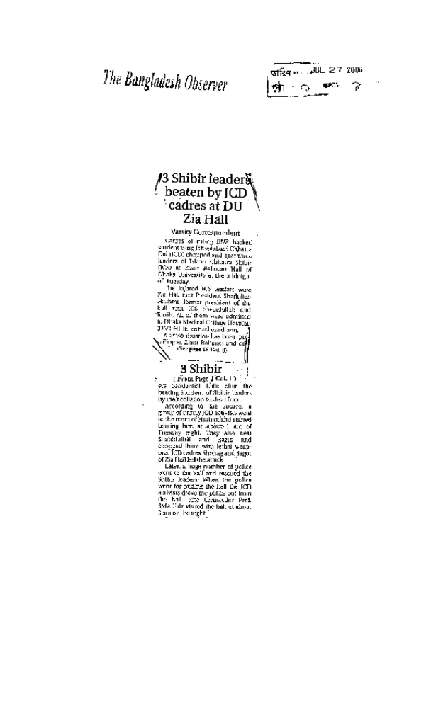 3 shibir leaders beaten by JCD cadres at DU Zia Hall Published on Newspaper The Bangladesh Observer Category Campus Terrorism Download