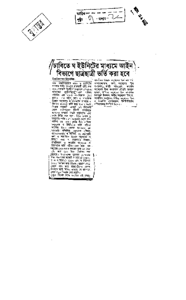 ঢাবিতে ঘ ইউনিটের মাধ্যমে আইন বিভাগে ছাত্রছাত্রী ভর্তি করা যাবে Published on Newspaper দৈনিক যুগান্তর Category General Education General Education Higher Education Public Download