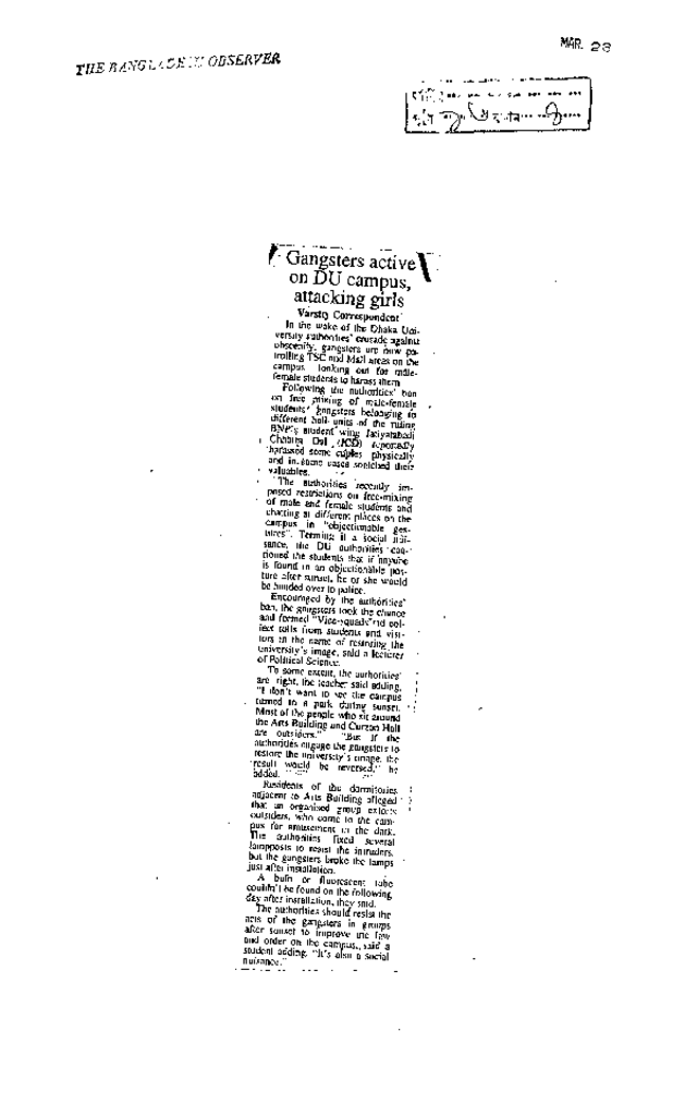 Gangsters active on DU campus, attacking girls Published on Newspaper The Bangladesh Observer Category Campus Terrorism Download
