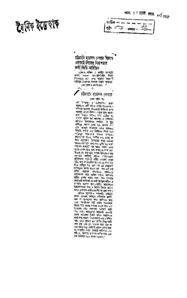 চট্রগ্রামে ছাত্রদল নেতার বিরূদ্ধে এসঅাই নিজের নিরাপত্তার জন্য জিডি করেছেন Published on Newspaper দৈনিক ইত্তেফাক Category Student Politics Download