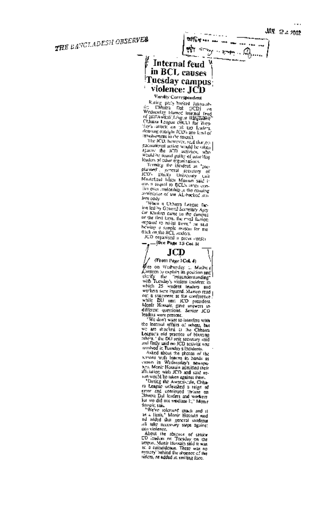 international feud in BCL causes Tuesday campus violence:JCD Published on Newspaper The Bangladesh Observer Category Campus Terrorism Download