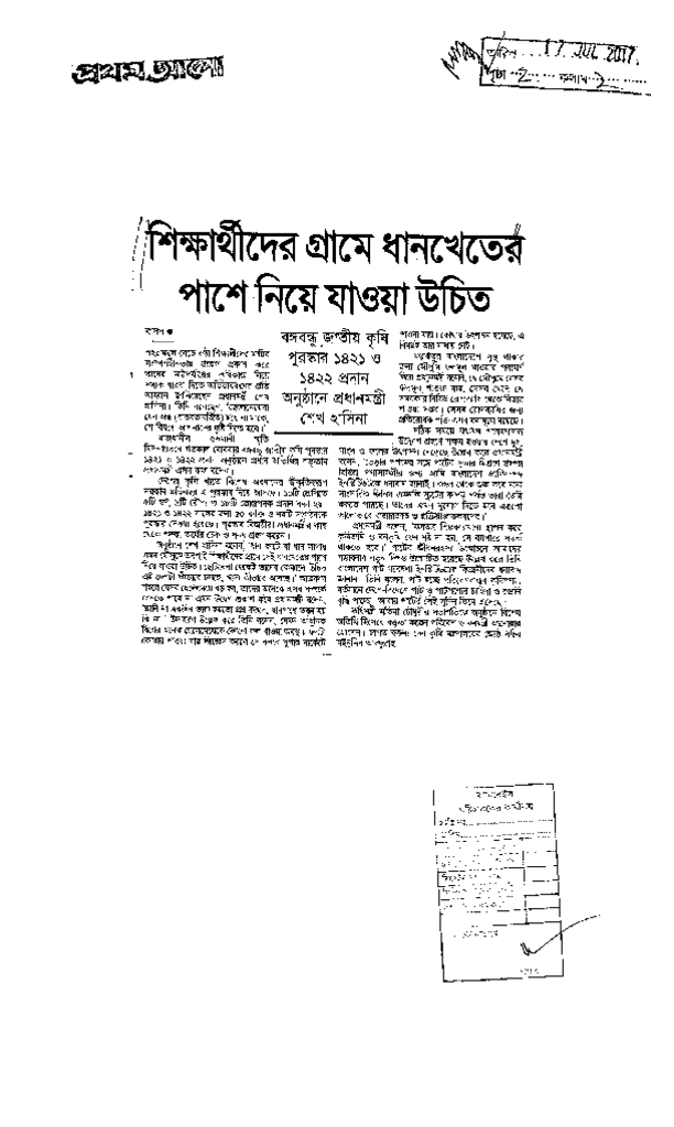 শিক্ষার্থীদের গ্রামে ধানখেতের পাশে নিয়ে যাওয়া উচিত Published on Newspaper দৈনিক প্রথম আলো Category Personal Opinion / Discussion / Commentary Personal Speech / Discussion / Comentary Secondary and Higher Secondary Education Download
