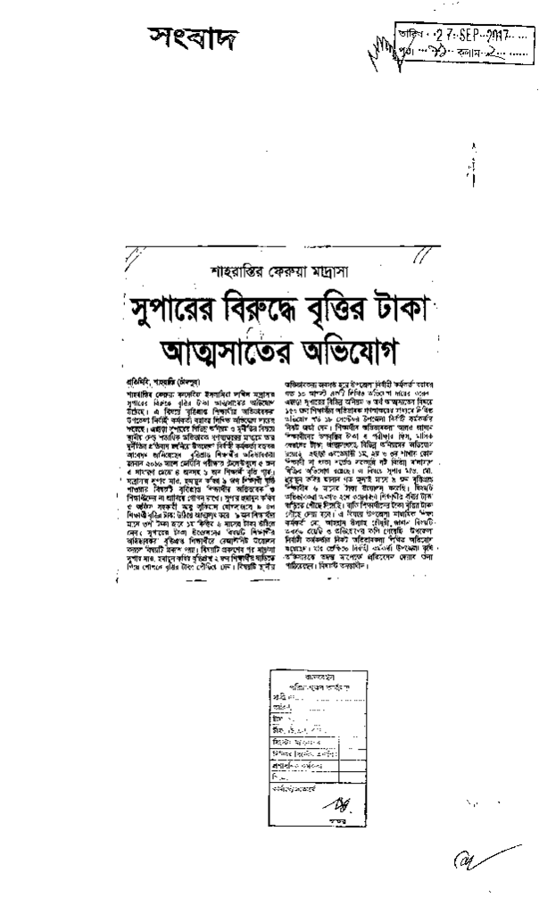সুপারের বিরুদ্ধে বৃত্তির টাকা আত্মসাতের অভিযোগ Published on Newspaper দৈনিক সংবাদ Category Madrasah Education Madrasah Education Alia Download