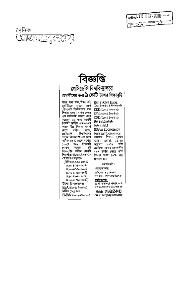 বিজ্ঞপ্তি প্রেসিডেন্সি বিশ্ববিদ্যালয়ে মেধাবীদের ১ কোটি টাকার শিক্ষাবৃ্ত্তি Published on Newspaper দৈনিক আমাদের সময় Category General Education General Education Higher Education Private Download