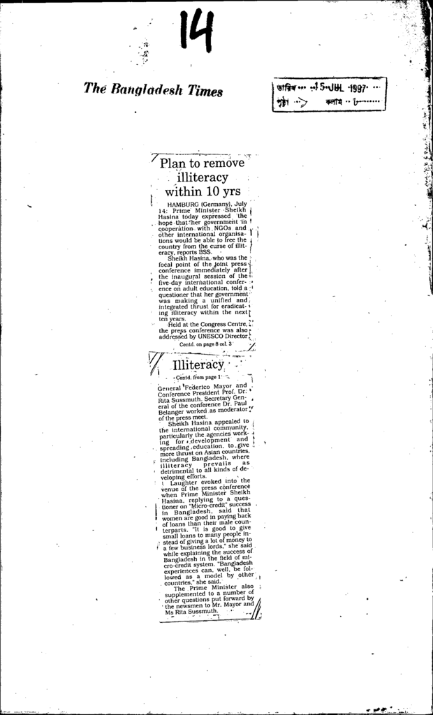 Plan to remove illiteracy withun 10 yrs Published on Newspaper The Bangladesh Times Category Personal Opinion / Discussion / Commentary Download