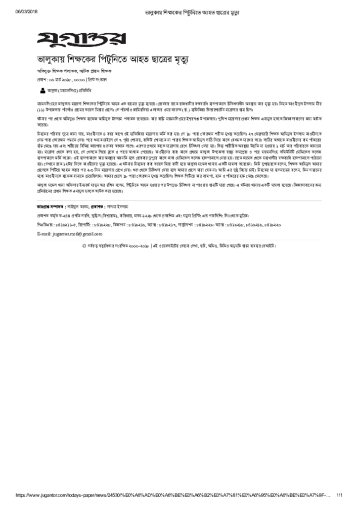 ভালুকায় শিক্ষকের পিটুনিতে আহত ছাত্রের মৃত্যু Published on Newspaper দৈনিক যুগান্তর Category Madrasah Education Madrasah Education Qawmi Download