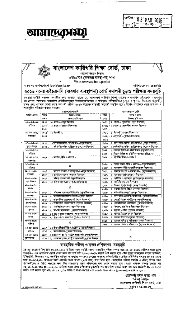বাংলাদেশ কারিগরি শিক্ষাবোর্ড, ঢাকা ২০১৬ সনের এইচএসসি (ব্যবসায় ব্যবস্থাপনা) বোর্ড সমাপনি পরীক্ষার সময়সূচি