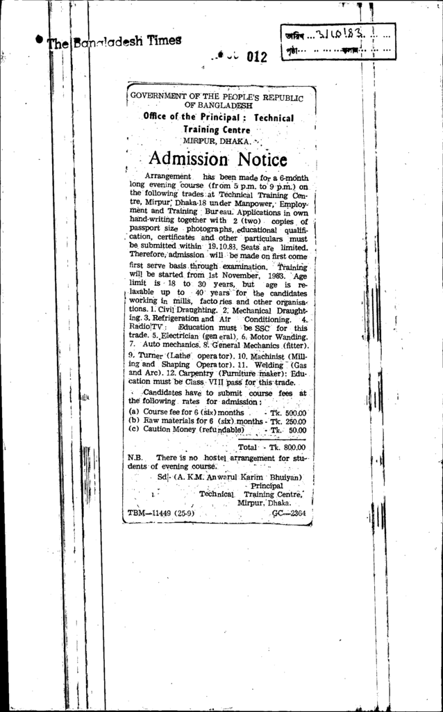 Admission notice Published on Newspaper The Bangladesh Times Category Admission / Seat Problem Download